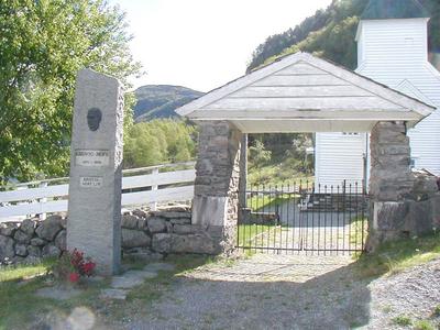 Minnestøtta over Ludvik Hope står tett ved kyrkjeporten til Sandnes kyrkje. Foto: Scandion.