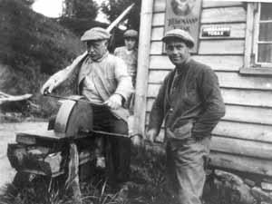 Frå venstre: Isak Eikemo sliper ljå, sonen Einar sveivar. Bak: Sonen Håkon Eikemo.