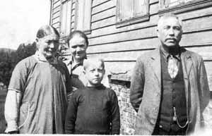Frå venstre: Anna Kristina Eikemo (kona til Isak), Tea Håland (tenestejente) frå Holmedal i Sunnfjord, Håkon Eikemo (son) og Isak Eikemo. Foto: Kjell Eikemo