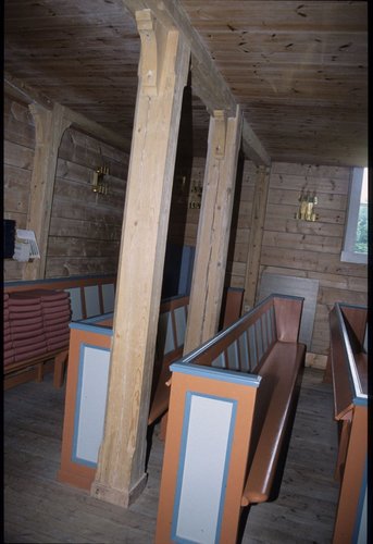 Bø kyrkje, detalj av søyler og kyrkjebenkar under galleriet bak i skipet. Foto: Arne Høyland.