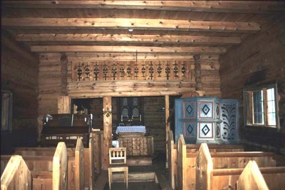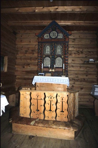 og altertavla er måla. Kyrkjebenkane står mot einan, rygg mot