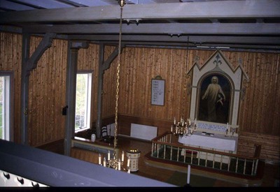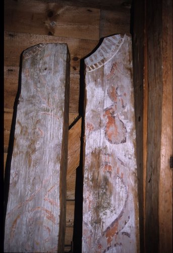 Restar etter rosemalte tømmerveggar i den gamle tømmerkyrkja på Stamnes, bygd i byrjinga av 1600-talet og riven i siste halvdel av 1800-talet. Foto: Arne Høyland.