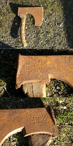 smed. Gamalt, litt skeivt kort skaft. Dekor og inskripsjon: 1856 H.E. Foto.