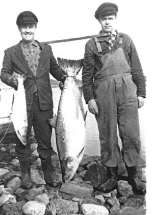 Sønene Arthur og Odin fangar storlaksen mens faren