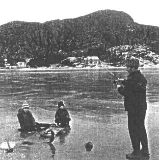 Einar Austgulen med gutane på isfiske i Brandangersundet.