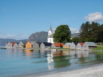 Selje ligg lunt til langs den 1/2 km lange kvite havstranda Seljesanden.